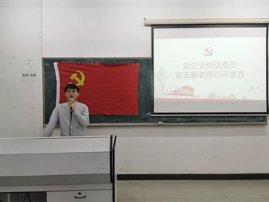 大会第七项议程党总支统战委员官志豪老师点评发言。官志豪老师表示本次会议准备工作充分、有序,全体党员能积极发言,全面仔细查找自身问题,准确、透彻剖析问题,并对全体党员真实客观的发言和敢于提出建议表示赞许。他强调,在今后工作中,要抓牢问题整改,全体党员齐心协力扎实做好落实工作;要做好密切联系群众的工作,深入群众所想所需所求;不断增强组织观念、责任意识和理论素质,坚定理想信念。同时,作为学生党员要起到先锋模范作用,严格要求自己,要履行党员职责和党员义务,希望大家不忘初心,砥砺前行!