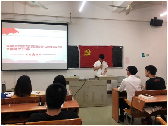 最后由陈浩峰同志宣布党支部委员会第一次全体会议选举结果和委员分工情况。党支部委员会换届选举结果:谢朋涛同志任支部书记、林维跃同志任支部副书记、朱选宾同志任组织委员、黎锦香同志任宣传委员、林伍权同志任纪检委员、梁文韬同志任统战委员、卢智峰同志任青年保卫委员。