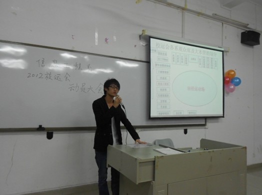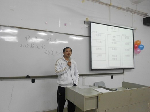 20121119星期一20:30,我系团总支学生会2012年校运会工作人员动员大会在创新楼E101顺利召开。此次大会的主要目的是在第六届校运会举办之前为团总支学生会各位工作人员做动员。我系党支部副书记蒋大锐、学生党支部书记蒋云丽、团总支书记、学生会指导老师王忍均出席了本次大会。