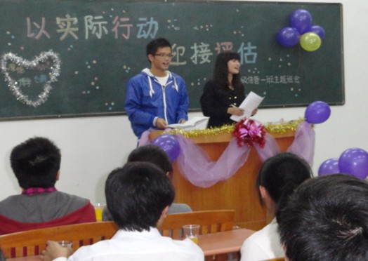 在主题班会上,各班同学紧紧围绕“以实际行动迎接专家组进校”这个主题,以各种形式表现出同学们对迎评工作的支持与配合。其中,10软件1班与11计科1班的组合、10信管2班与11软件1班、11信管1班这几个组合的班会组织得较为突出。