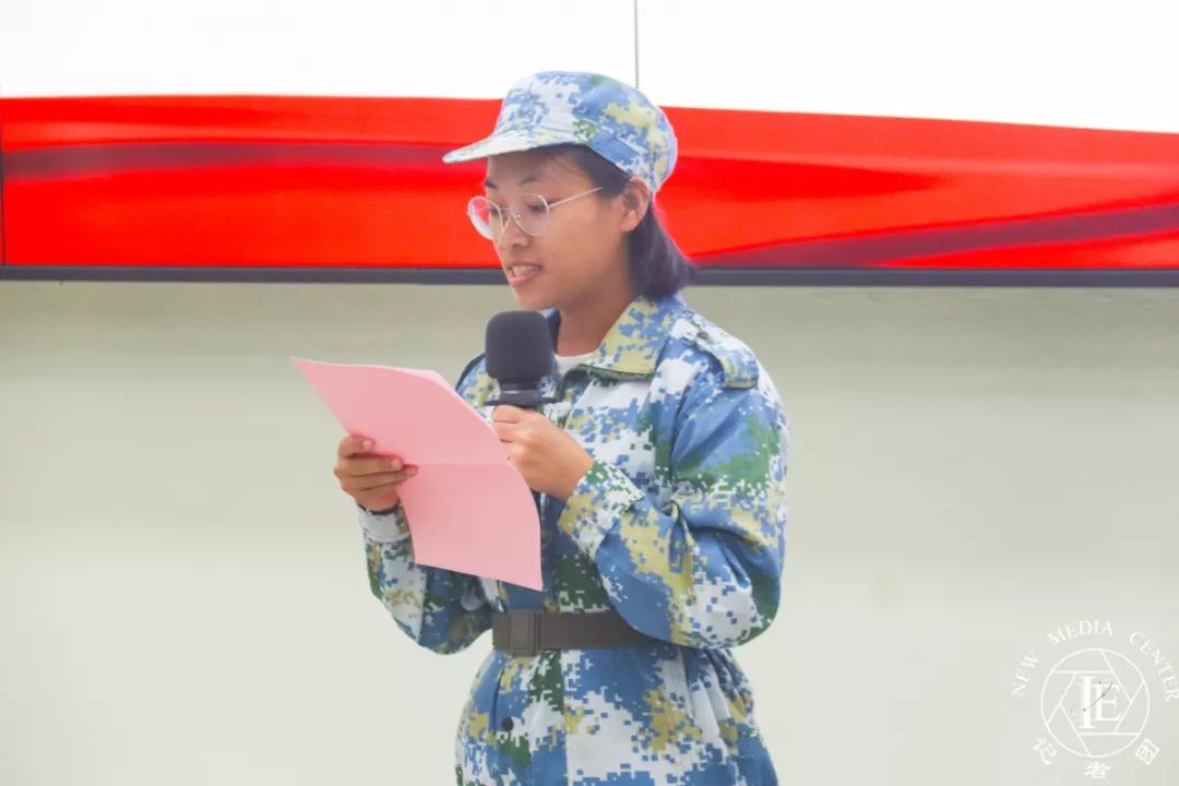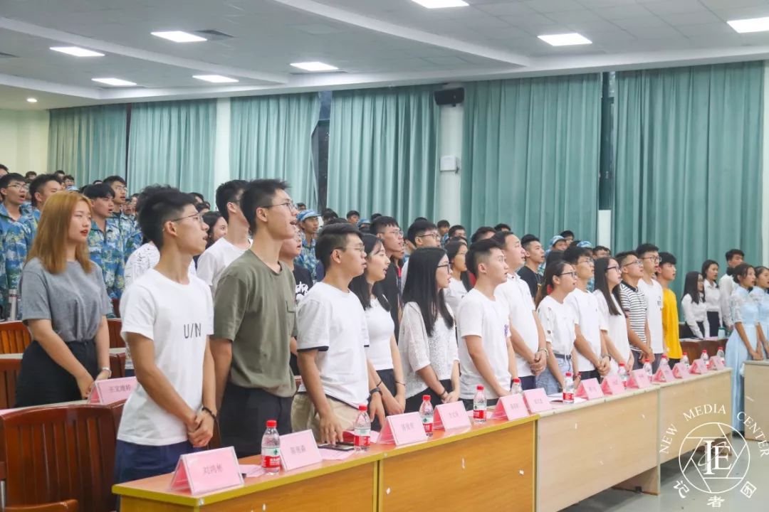 全体师生在主持人孔令明的带领下奏唱团歌。紧接着是播放视频环节。在视频中,我们可以看到新生们从入学到如今军训的变化,而视频也见证了新生们在逐渐的适应大学生活。