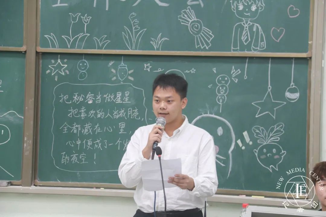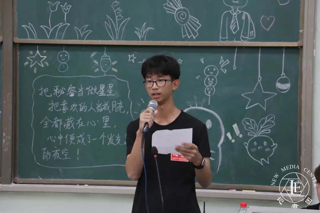 心理健康站部长代表周泳潮上台发言。首先,他希望同学们能把态度调整好,在部门的生活中成长、不断进步。其次,希望同学们能够把效率提到最高,把握时间,做到真正的“学习课余两不误。”最后,他希望同学们可以调节好自己的心态,自信、阳光地面对每一天。