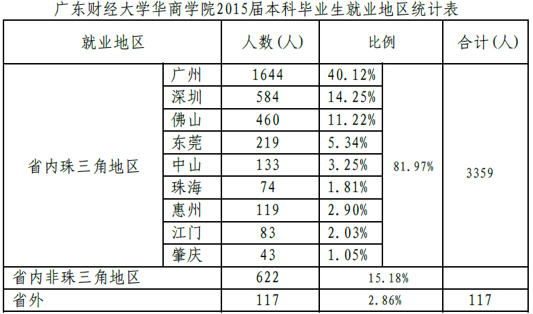 截至 2015 年 9 月 1 日止,我校 2015 届已就业本科毕业生总数为4098 人,其中在珠三角地区就业的有 3359 人,占已就业本科生人数的81.97%;在省内珠三角地区以外的有 622 人,占全校已就业本科生人数15.18% ;在外省就业的有 117 人,占全校已就业本科生人数 2.85%。详情请参看下表。
