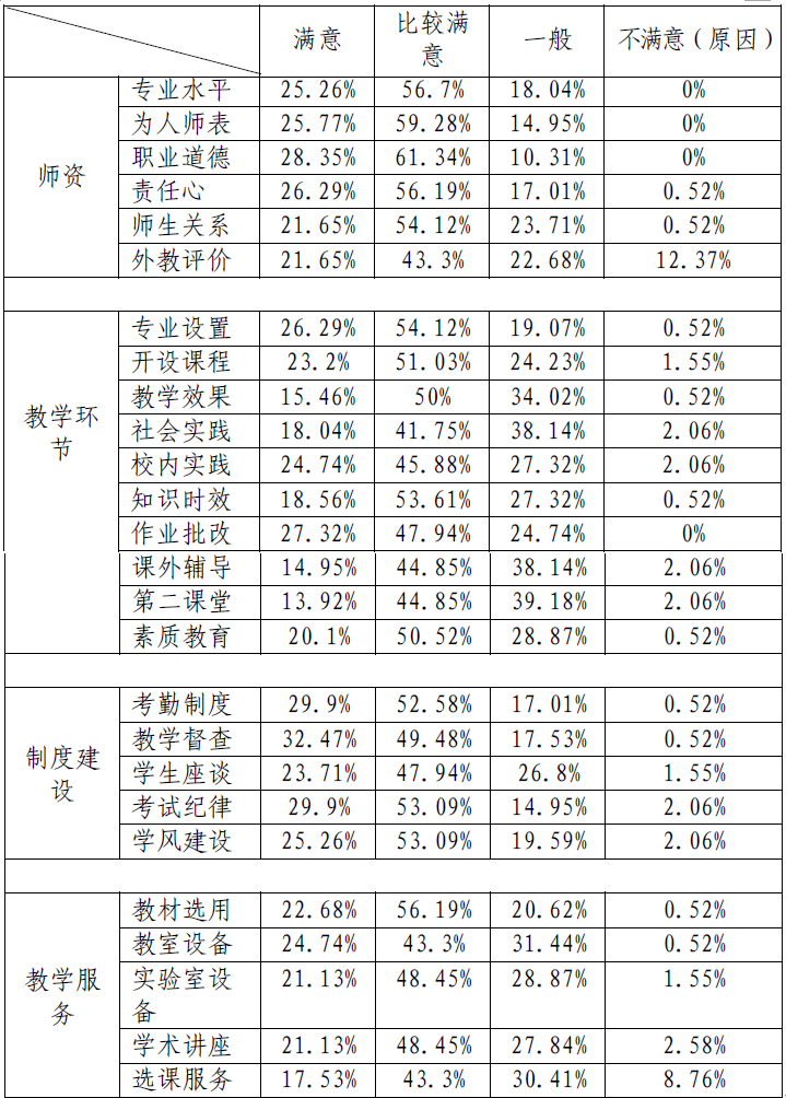 此次调查发出用人单位作答问卷1250 份,回收问卷 1230 份,取其中 1220 份问卷进行统计和数据分析。结果显示,毕业生对我校教学中的师资、教学环节、制度建设、教学服务等方面的满意度较高,对我校的教学效果也较为认可。