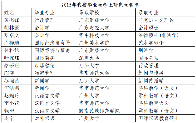 2015 年我校毕业生考上研究生共 14 人,名单如下: