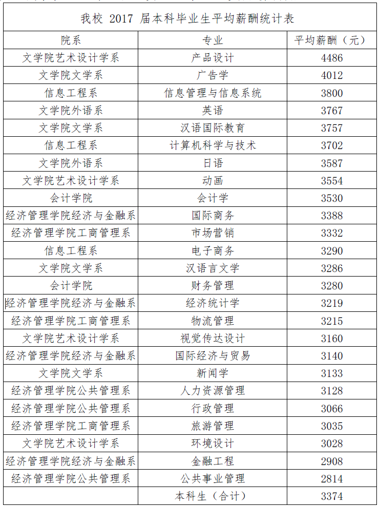大学生就业在线院校应用系统中的数据显示,我校2017 年毕业生的平均薪酬约为 3374 元,其中最高的是产品设计专业,平均薪酬 4486元;其次是广告学,为 4012 元;再次是信息管理与信息系统,为 3800 元。因为此项数据统计时间刚好为毕业生入职的实习期或者试用期,数据显示为毕业生的入职工资,比毕业生实际薪酬低。