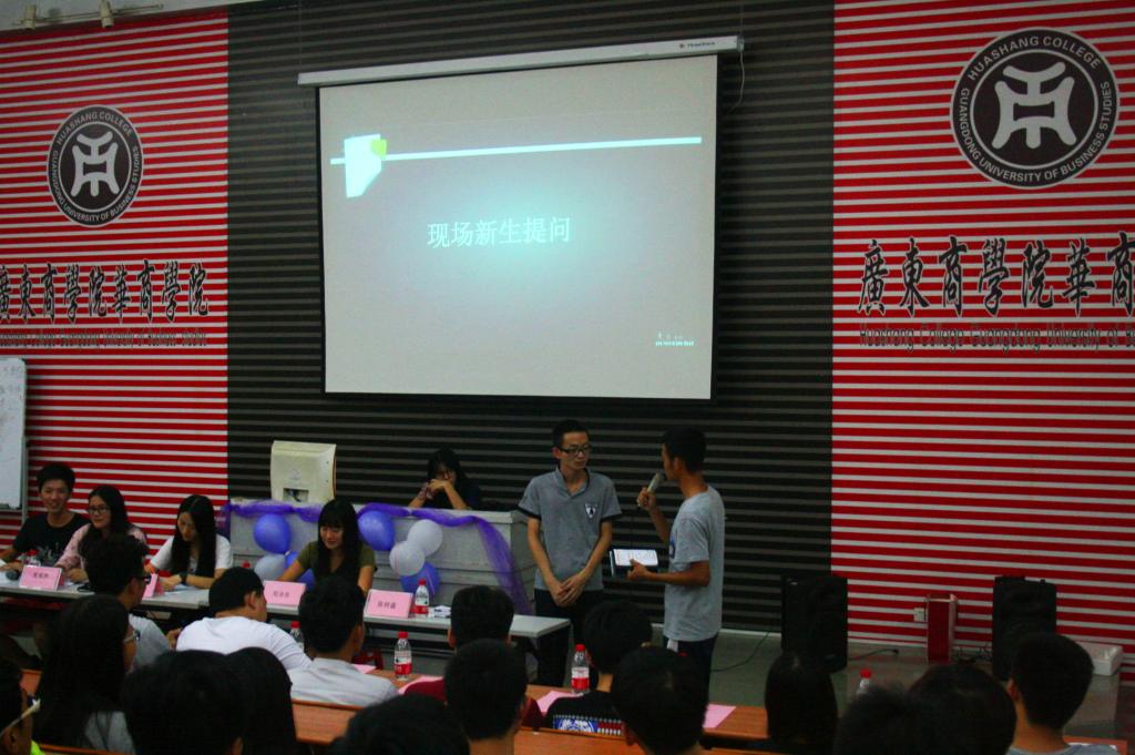 在现场新生自由提问中,主持人的鼓励和老生代表的热情解答,使得现场的新生勇敢地站起来或走到讲台前对老生代表进行提问。新生提问的问题范围较广,如“大学里哪些元素最重要”、“在我们学校能否提前实习”、“华商的创业平台如何”等。蒋大锐老师上台进行大概的总结和解答新生疑问,整个活动现场透着浓厚的学术、好学的气息,掌声阵阵。