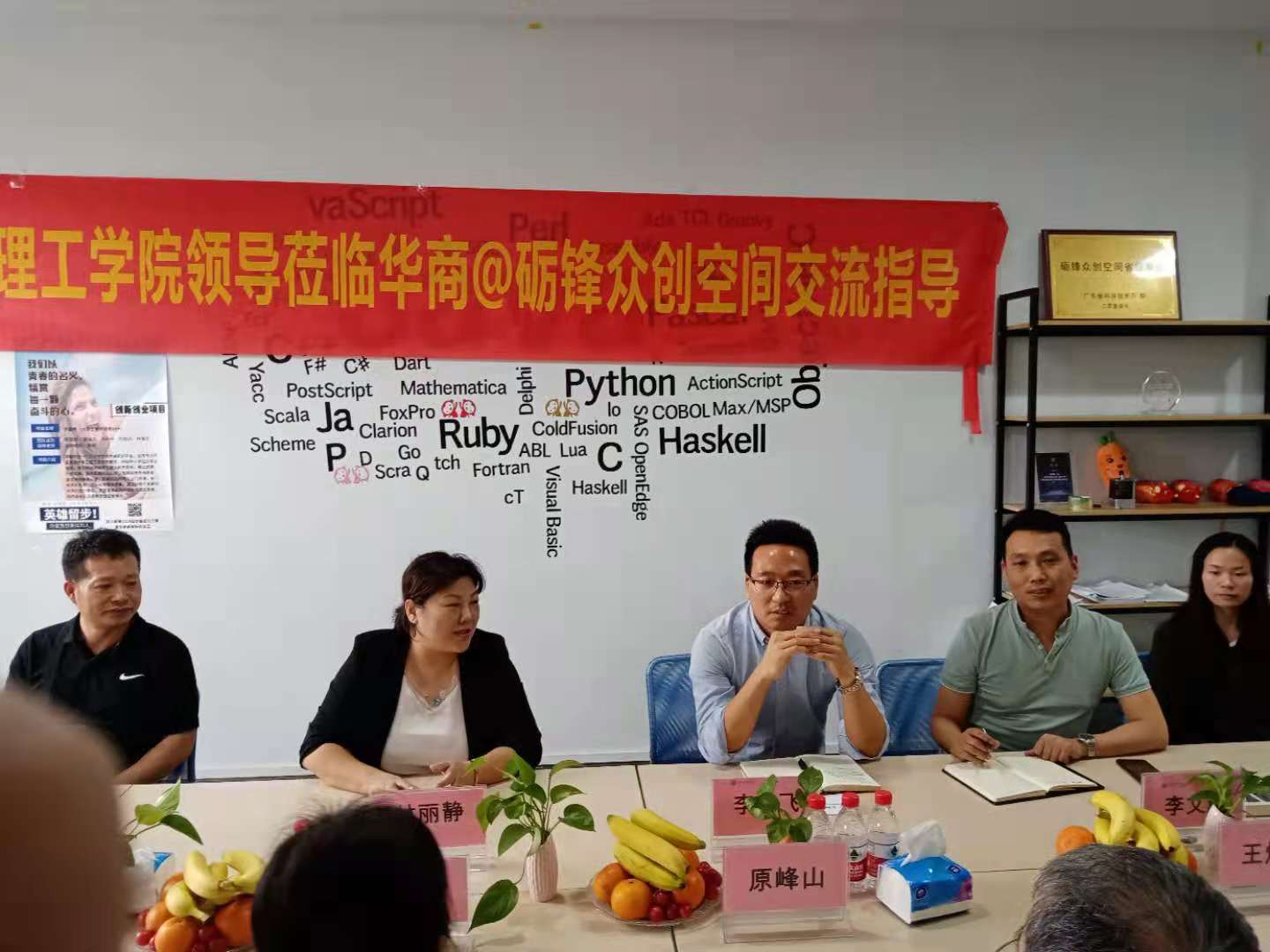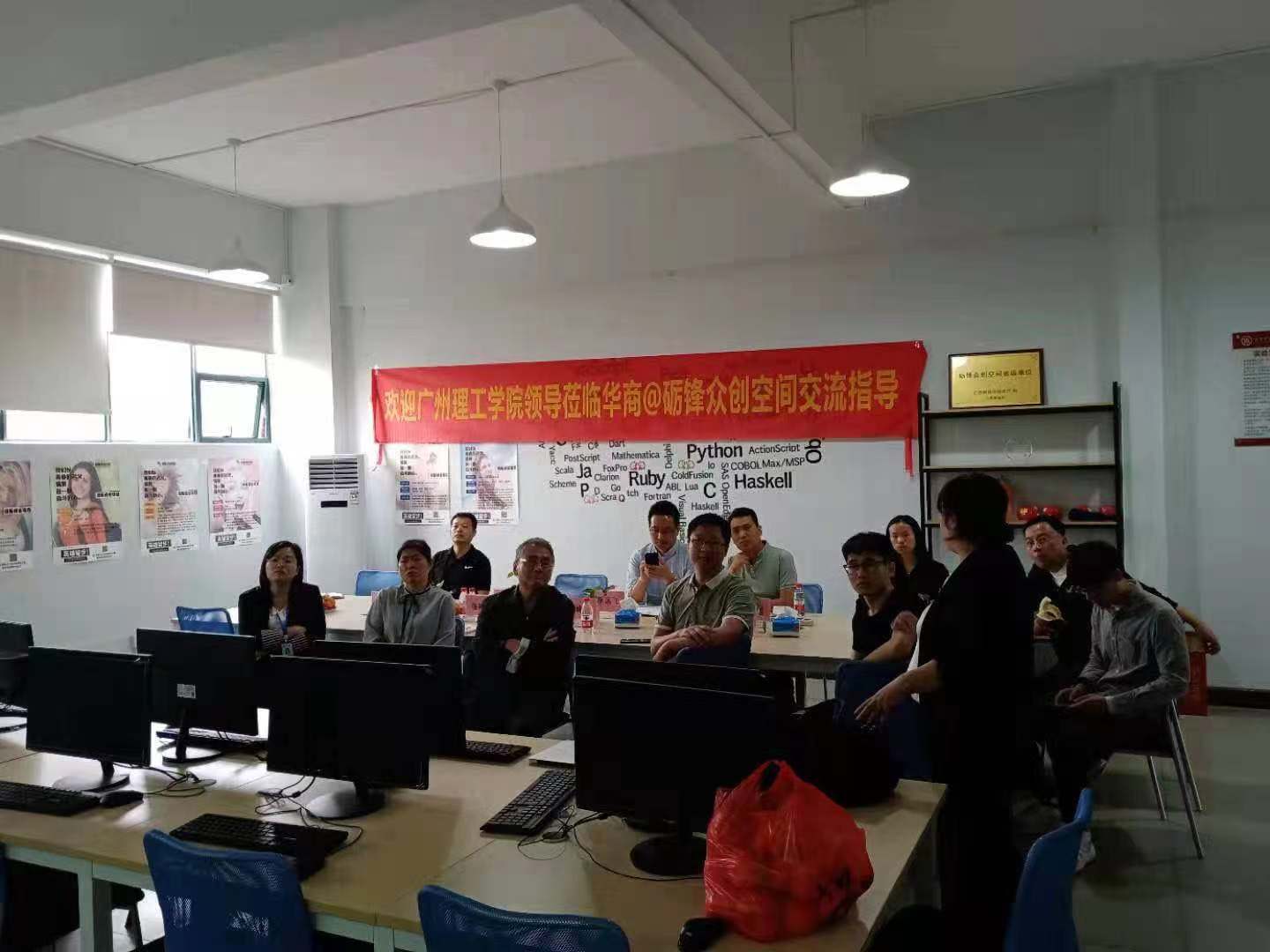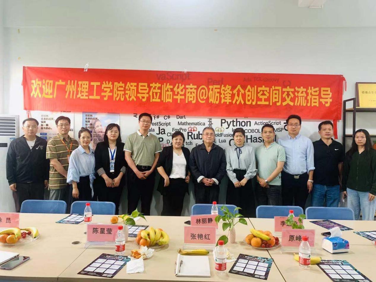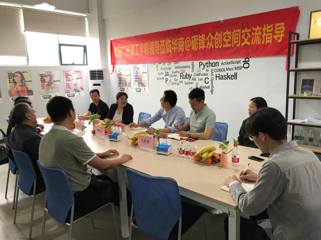 昨日,广州理工学院计算机科学与工程学院领导原峰山院长、王煜林副院长、张艳红主任、陈星莹主任一行,在华商数据科学学院--李远飞副院长、创新创业项目负责人李文彪老师、肖绍洪主任、陈刚主任、等领导的陪同下,参观我们砺锋科技驻华商的众创空间,对于学生创新创业教育专项调研,了解众创空间建设和运营的进展情况。