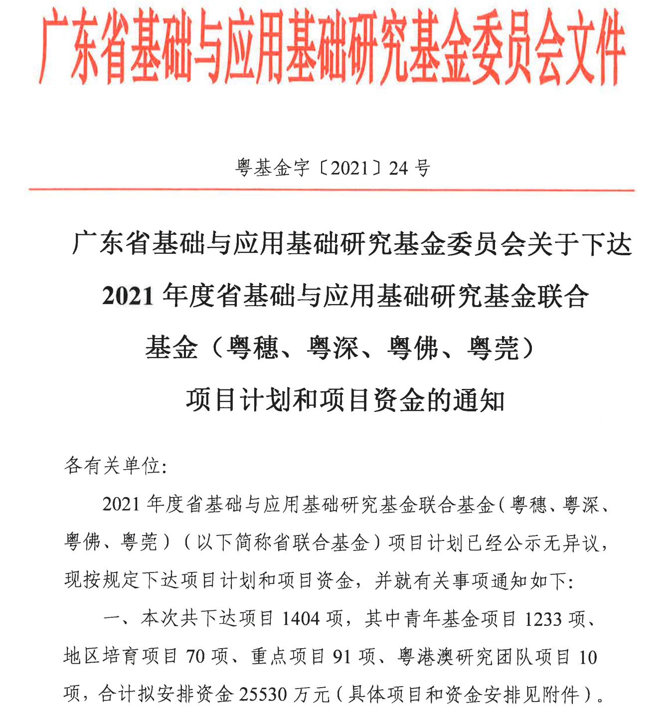 根据《广东省省级财政专项资金管理办法(试行)》《广东省基础与应用基础研究基金联合基金工作指引(试行)》等有关规定,经形式审查、通讯评审、会议评审(重点项目、粤港澳研究团队项目)等程序,2021年度广东省基础与应用基础研究基金省市联合基金共拟资助项目1404项(青年基金项目1233项,地区培育项目70项,重点项目91项,粤港澳研究团队项目10项)。广州华商学院数据科学学院侯春娟副教授喜获此次省联合基金青年基金项目立项。此次立项,是李远飞科研团队的阶段性成果,也是历年来我校在省自然科学基金、省联合基金申报立项上新的突破!