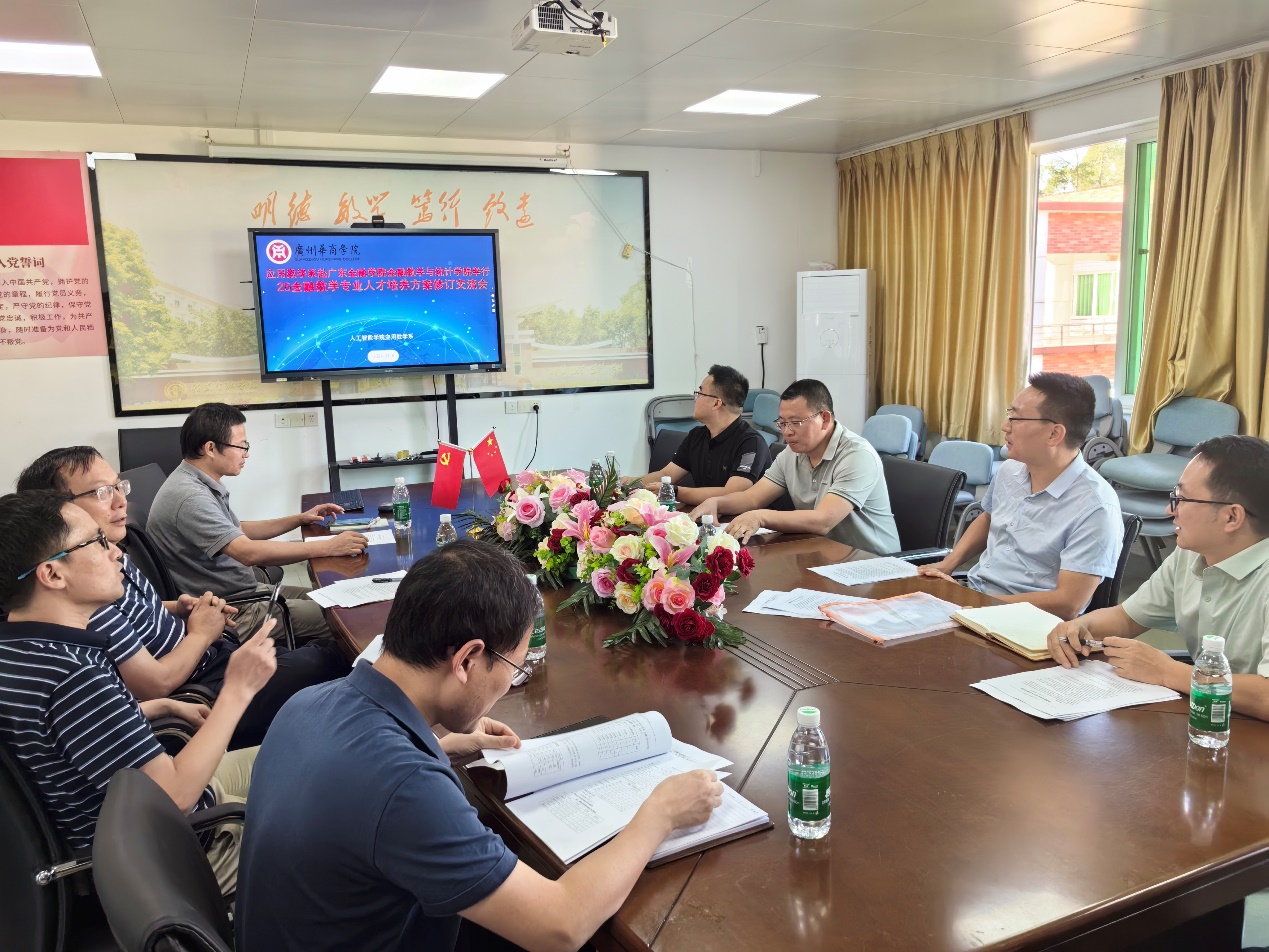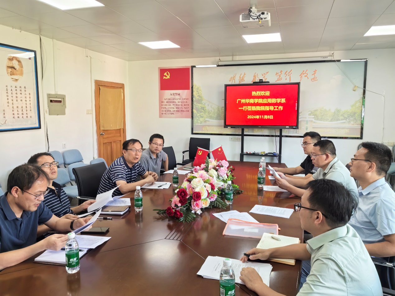 2024 年 11 月 8 日下午,广州华商学院人工智能学院金融数学专业骨干教师石金诚、李志青、欧阳柏平、李远飞一行前往广东金融学院金融数学与统计学院,就 “金融数学专业基于 OBE 理念的人才培养模式” 展开调研及研讨。广东金融学院金融数学与统计学院院长刘炎教授、副院长陈员龙教授、金融数学系主任柴富杰教授、骨干教师骆世广副教授等热情接待。