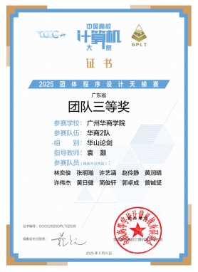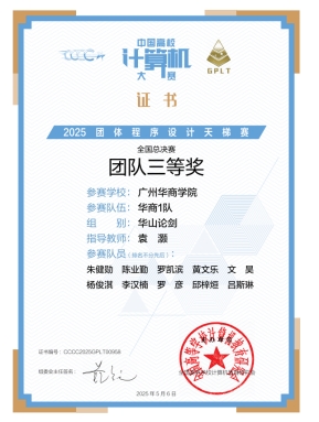 2025 年 4 月 19 日,第十届 “中国高校计算机大赛 - 团体程序设计天梯赛(简称CCCC-GPLT)” 全国总决赛在云端圆满落下帷幕。广州华商学院人工智能学院组织了4支队伍共40名学生参赛。在经历四个小时与全国众多高校优秀队伍进行激烈竞争中,我校学子奋勇拼搏,取得优异成绩!最终,由22本计算机科学与技术1班陈业勤、23本软件工程4班罗凯滨、24本计算机科学与技术创新3班朱健勋等10名同学组成的“华商1队”以1227分荣获全国总决赛团队三等奖并获广东省团队二等奖;由23本计算机科学与技术2班林奕俊、23本软件工程4班张明瀚等10名同学组成的“华商2队” 荣获广东省团队三等奖,其余两支队伍获得成功参赛证书。同时,在由494所高校参加的华山论剑组中,我校的总成绩全国高校排名第249位、广东省高校排名第20位,创下新的记录。