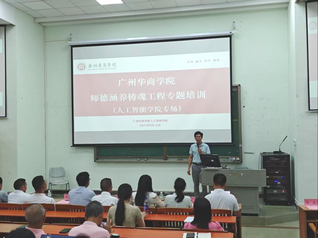 2025年9月16日下午,人工智能学院在励志楼D208顺利举办师德涵养铸魂工程专题培训活动。本次培训旨在深入贯彻落实新时代师德师风建设要求,推动教育家型教师培养,全面提升教师队伍的综合素质和育人能力。广东金融学院许国动研究员应邀作专题报告,党委教师工作部部长庞革英、教师发展中心主任杨俏文、人工智能学院领导班子及全体教师参加培训,培训由学院党委书记兼副院长杨波主持。