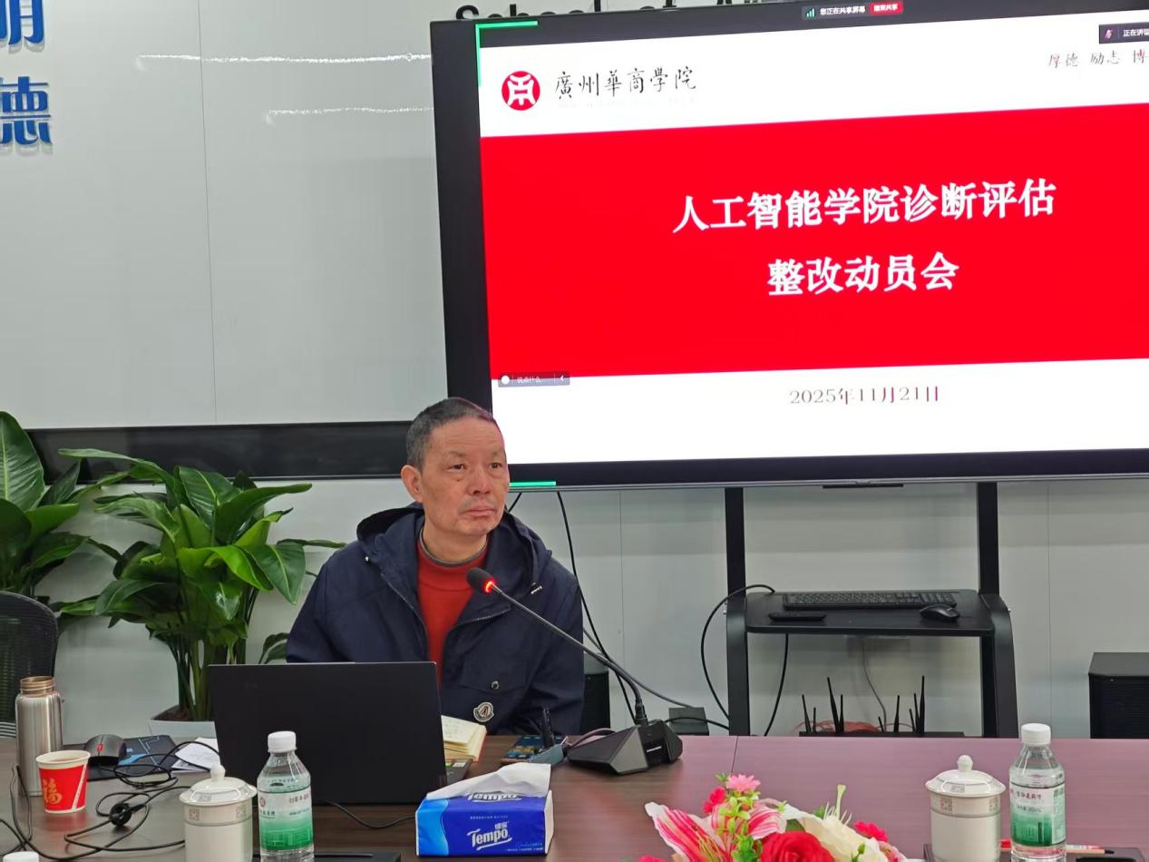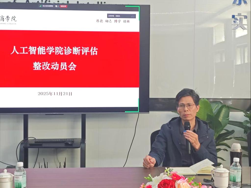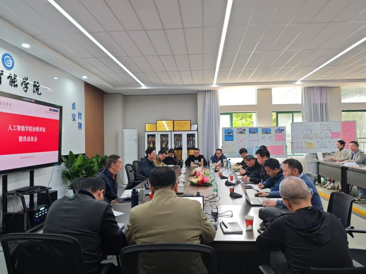 2025年11月21日上午,人工智能学院在创新楼301会议室组织召开诊断评估整改动员会,全面复盘总结前期诊断评估工作,深入剖析存在的不足,并就下一阶段的整改任务进行动员和部署。学院院长戴经国主持会议,学院党委书记、副院长杨波,党委副书记何顺发,副院长叶仕通,院长助理洪绍勇、杨本胜以及各系正副主任、教学督导、辅导员、教学秘书等参加会议。