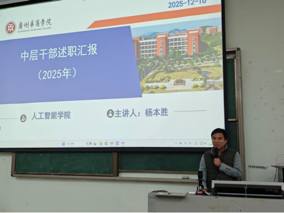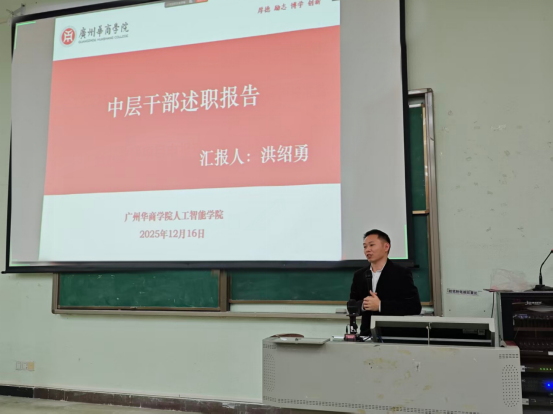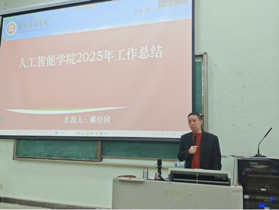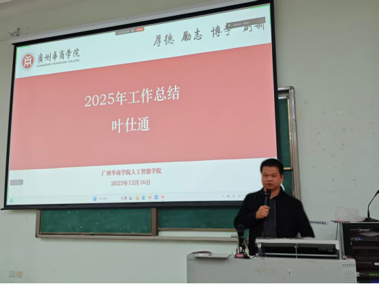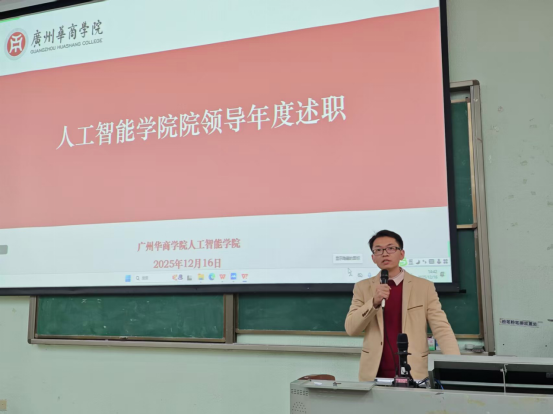2025年12月16日下午,广州华商学院人工智能学院在励志楼D208召开2025年度考核大会暨期末部署大会,包含科级干部民主测评、年终考核述职及期末工作部署等多个重要环节。会议由戴经国院长主持,学院领导班子及全体教职工参加会议。