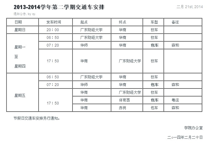 热点新闻 当前位置: 首页 >> 正文 2013-2014学年第二学期交通车安排 2014-11-19 上一条:广州高校增城片区“中星杯”网络攻防大赛方案 下一条:关于中秋节、国庆节交通行车安排的通知 【关闭】