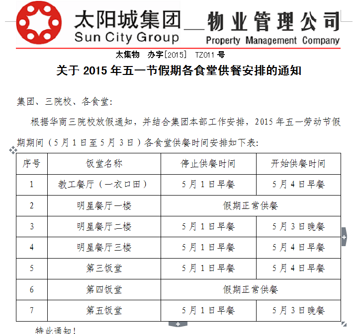 热点新闻 当前位置: 首页 >> 正文 2015年劳动节放假食堂供餐安排的通知 2015-04-29 上一条:关于2015年“五一”劳动节期间交通车安排的通知 下一条:2015年劳动节、青年节放假通知 【关闭】
