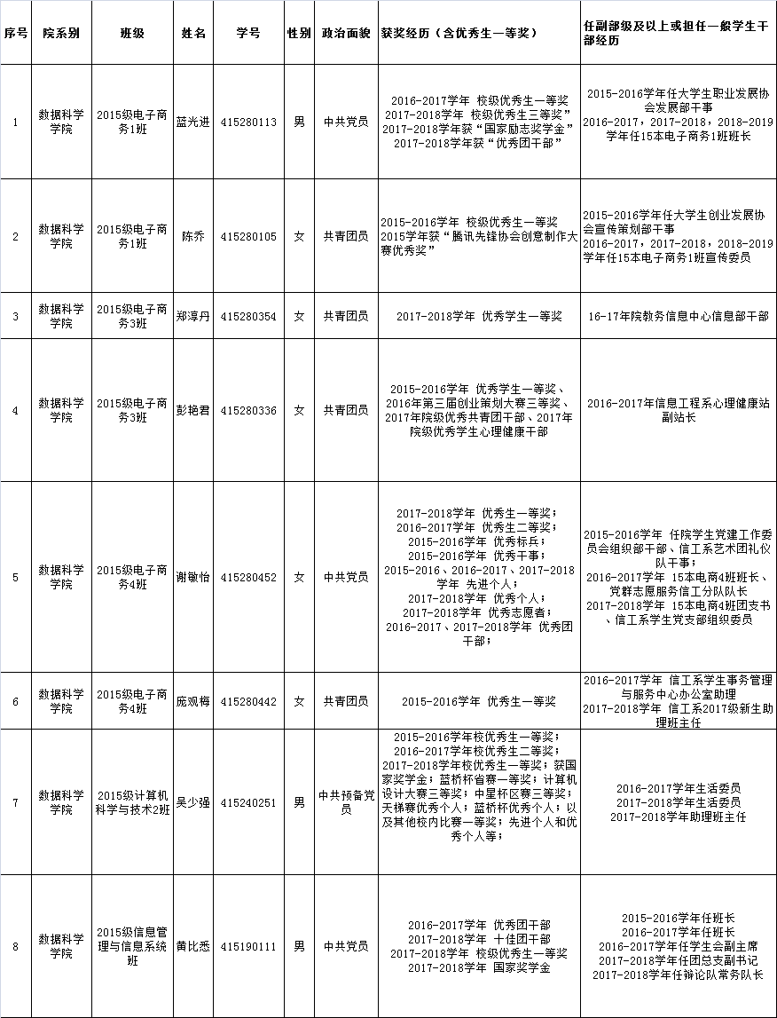 热点新闻 当前位置: 首页 >> 正文 数据科学学院2019届优秀毕业生候选人公示 2019-05-20 数据科学学院 根据《广东财经大学华商学院优秀毕业生评选奖励办法》中的“优秀毕业生”评选条件,经个人提交申请、班级组织初评,数据科学学院组织审核,拟决定推荐蓝光进、黄比悉等8位同学为2019届优秀毕业生候选人,现将评选结果进行公示,名单如下: 公示期为2019年5月20日--5月22日(共3天),若对评优结果有异议者,请在公示期内向数据科学学院办公室反馈。 联系电话:020-26222963 广东财经大学华商学院数据科学学院 2019年5月20日 附件【65c78106cf8692aff80dd114146813d.png】已下载次 上一条:2019年广东财经大学华商学院数据科学学院职称申报人员名单公示 下一条:2019年寒假放假通知及安全警示 【关闭】