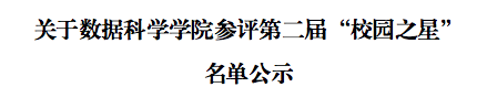 为深入贯彻习近平新时代中国特色社会主义思想,进一步培育和践行社会主义核心价值观,根据《关于评选第二届“校园之星”的通知》、《广州华商学院“十大校园之星”评选办法》等文件精神,数据科学学院开展了相关评优工作,现将学习之星、创业之星、科创之星、技能之星、公益之星、服务之星、体育之星、文艺之心拟评名单公式如下: