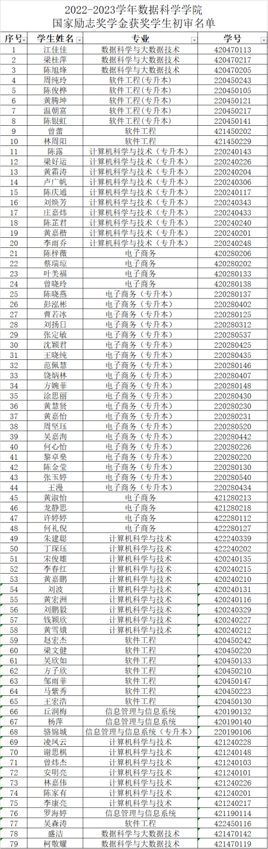 根据华商院学[2023]21号文件《关于做好2023年广州华商学院国家奖助学金工作的通知》的规定要求,本着“公开、公正、公平、择优”的原则,在广泛宣传基础上,经学生本人申请、班级评议、学院国家励志奖学金评定小组审核,我院决定拟推荐江佳佳、梁桂萍等79名同学参加学校国家励志奖学金评选,现给予公示。