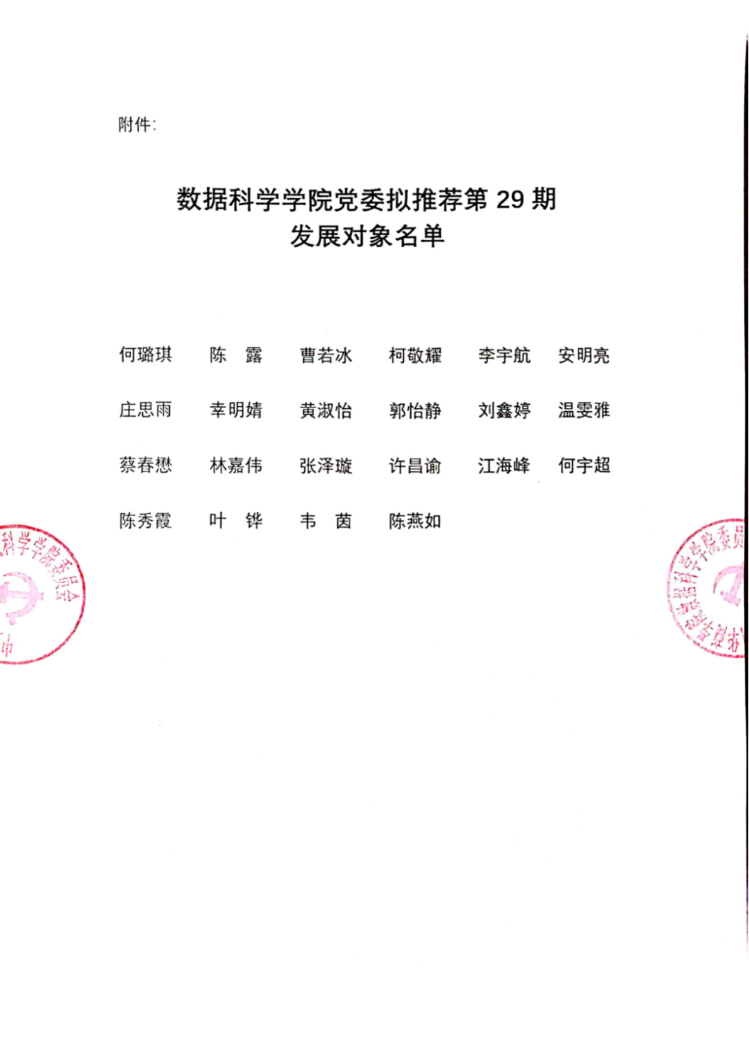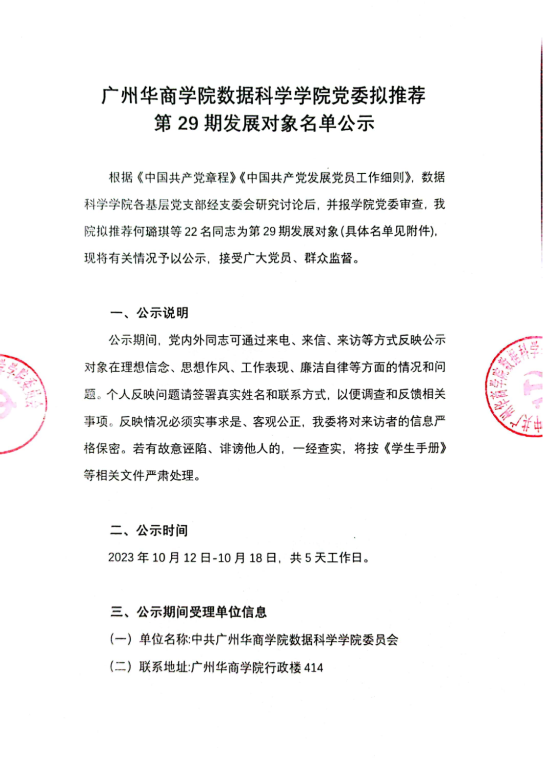 热点新闻 当前位置: 首页 >> 正文 广州华商学院数据科学学院党委拟推荐第29期发展对象名单公示 2023-10-13 根据《中国共产党章程》、《广州华商学院发展党员工作实施细则(试行)》等相关文件规定,结合组织工作实际情况,数据科学学院各基层党支部开展选拔入党积极分子举荐拟确定为发展对象。经过统一笔试、个人谈话、组织考察、综合考察材料、群众意见和推优工作小组及支委会研究讨论,并报学院党委审查,我院拟举荐何璐琪等22 名同志为第 29 期发展对象(具体名单见附件),现将有关情况予以公示,接受广大党员、群众监督。现予以公示如下: 上一条:关于开办人工智能大模型专家讲座的通知 下一条:学院资讯 | 数据科学学院2022-2023学年优秀学生干部初审名单公示 【关闭】