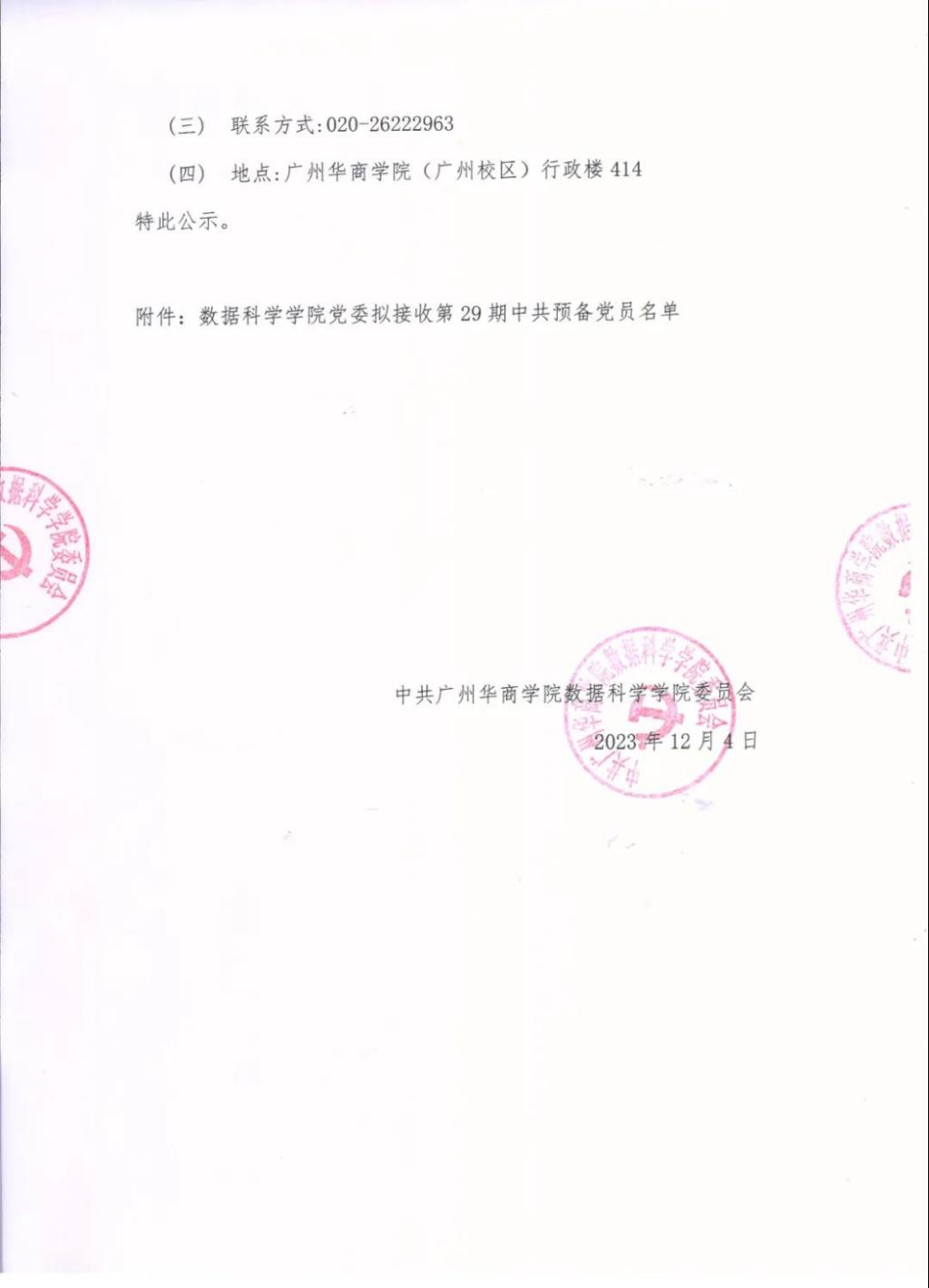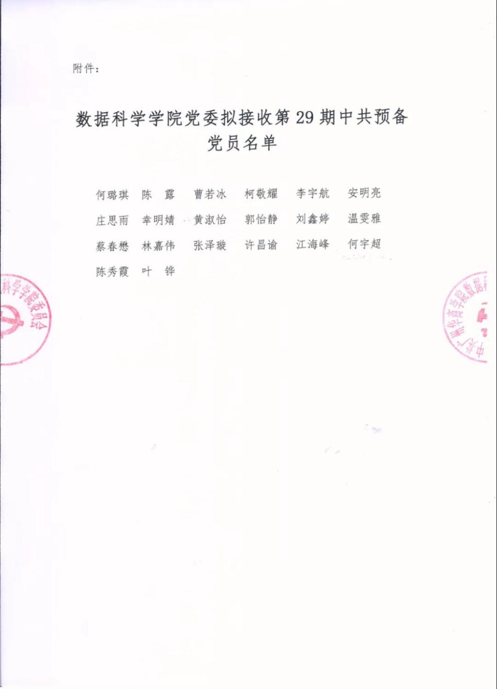 热点新闻 当前位置: 首页 >> 正文 广州华商学院数据科学学院党委拟接收第29期发展对象为中共预备党员名单公示 2023-12-04 经党支部培养、教育和考察,在听取培养联系人、党员和群众意见的基础上,经各党支部讨论研究并报学院党委审查,同意将何璐琪等20位同志拟接收为中共预备党员(具体名单见附件),现予以公示如下: 【关闭】
