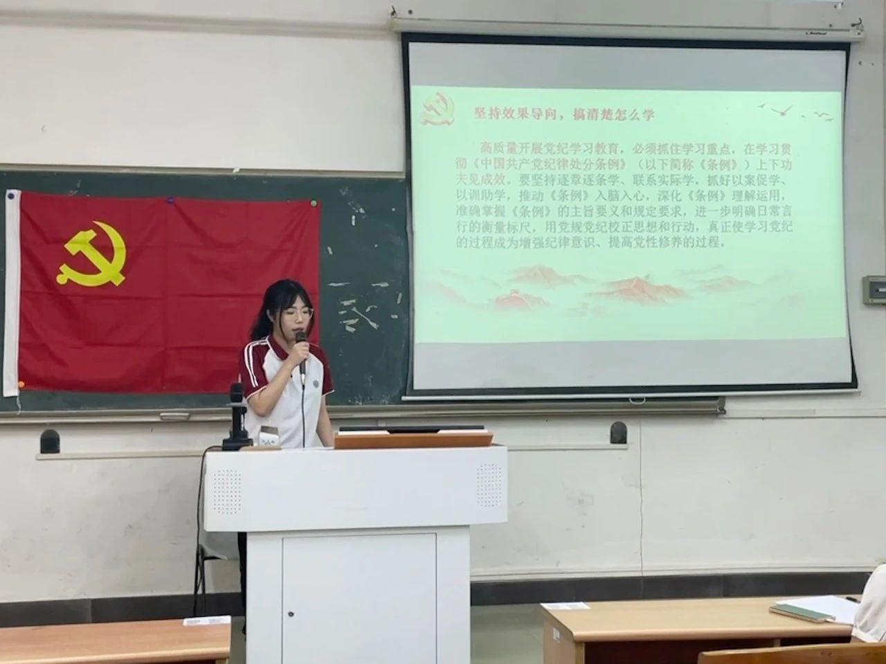 由施宛菁同志带领与会党员从三个导向出发,深入学习党的纪律,推动党纪学习教育走实走深。三个导向分别为坚持目标导向,搞清楚为何学、坚持问题导向,搞清楚学什么、坚持效果导向,搞清楚怎么学,通过坚持这三个导向,我们能够更好地推动党纪学习教育的深入发展,推动党纪学习教育取得实实在在的成效。学生党员应当秉持细致入微的态度,逐章逐条地深入学习《条例》的核心精神,不断校准自己的思想和行动,确保学习党纪的过程能深化我们的纪律意识,提升我们的党性修养,将党的纪律要求内化于心、外化于行,为实现党的目标和任务贡献自己的力量。