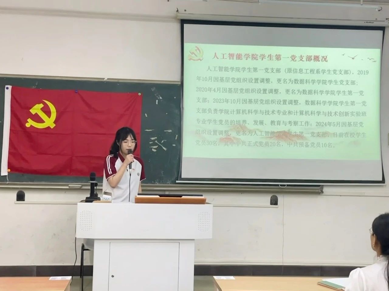 人工智能学院学生第一党支部 (原信息工程系学生党支部),2019年10月因基层党组织设置调整,更名为数据科学学院学生党支部; 2020年4月因基层党组织设置调整,更名为数据科学学院学生第一党支部;2023年10月因基层党组织设置调整,数据科学学院学生第一党支部负责学院计算机科学与技术专业和计算机科学与技术创新实验班专业学生党员的培养、发展、教育与考察工作;2024年5月因基层党组织设置调整,更名为人工智能学院学生第一党支部。目前在校学生党员30名,其中中共正式党员20名,中共预备党员10名。