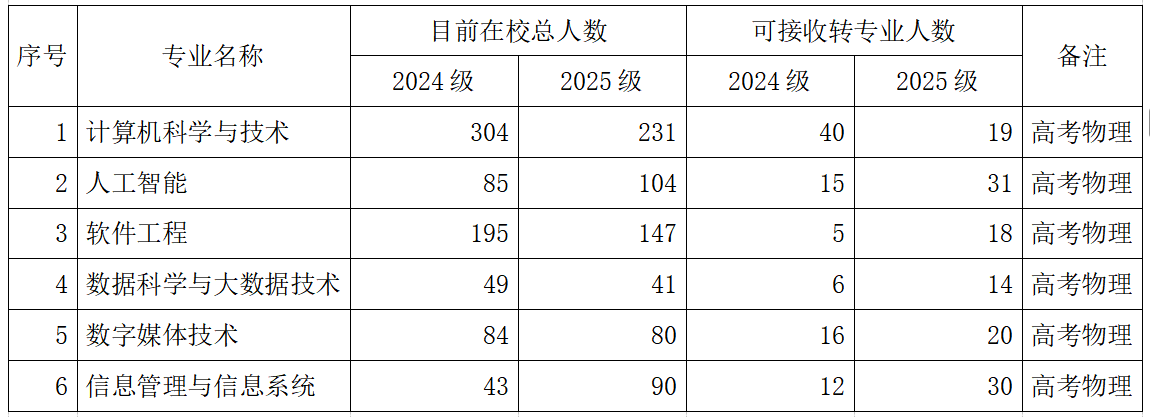 热点新闻 当前位置: 首页 >> 正文 人工智能学院学院2025-2026学年第二学期可接收转专业学生人数 2025-12-01 根据《广州华商学院学生转专业管理办法》、《人工智能学院学生转专业实施细则》,经核算,2025-2026学年第二学期,我院各专业可接收转专业学生人数如下: 人工智能学院 2025年11月21日 上一条:关于同意卢貝儿等40位同学转专业的公示 下一条:人工智能学院转专业实施细则 【关闭】