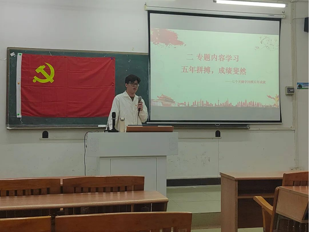 陈炽堃同志首先带领参会人员从七个关键字回顾了我们过去五年所取得的伟大成就,学习了新征程上我们未来的发展方向和新时代实施科教兴国战略、强化现代化建设人才支撑的总体要求和重点任务。过去五年我们在经济发展、脱贫攻坚、科技创新、优化经济结构、完善基础设施、深化改革开放、改善生态环境、提高人民生活水平等八个方面的发展都取得了来之不易的新成就。未来我们也要更加紧密地团结在以习近平同志为核心的党中央周围,高举中国特色社会主义伟大旗帜,坚持以习近平新时代中国特色社会主义思想为指导,全面贯彻党的二十大精神,自信自强、守正创新,凝心聚力、埋头苦干,为全面建设社会主义现代化国家、全面推进中华民族伟大复兴而团结奋斗!