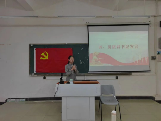 裴祖君书记表示,坚持人民至上是我们党百年奋斗的历史经验。要做到这一点首先要求我们自身水平够高,正所谓打铁还需自身硬,我们只有自己的专业水平够高,我们才能更好的坚持人民至上为人民服务。学生党员干部更需要提高自己的水平才能更好的服务组织服务班级。此外,裴祖君书记提到近期学院开展的自强之星评选活动中很多同学看到需要上台演讲就退缩不敢报名,书记表示,身为党员我们要有不怕困难的勇气,要敢于去挑战自我,突破自我,激励参会人员要不怕困难,勇于挑战自我,要享受突破自我的过程。最后,裴祖君书记还提到我们也要坚持问题为导向的思想,调整好自己的心态去解决问题。