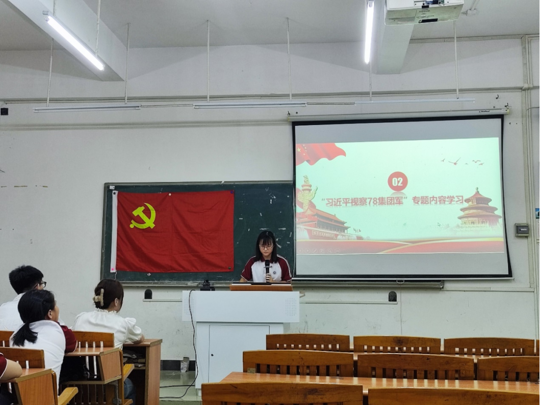为提高党支部的创造力、凝聚力和战斗力,学习部队教育管理,深入贯彻党的建设会议精神。数据科学学院学生第三党支部于2023年9月13日17:50在励志楼D103开展“习近平总书记视察78集团军”党日主题活动。出席本次会议的有数据科学学院学生第三党支部书记吴诗雨老师、支部全体党员,会议由黄秋格同志主持。