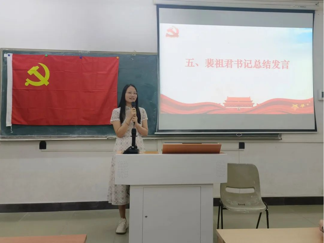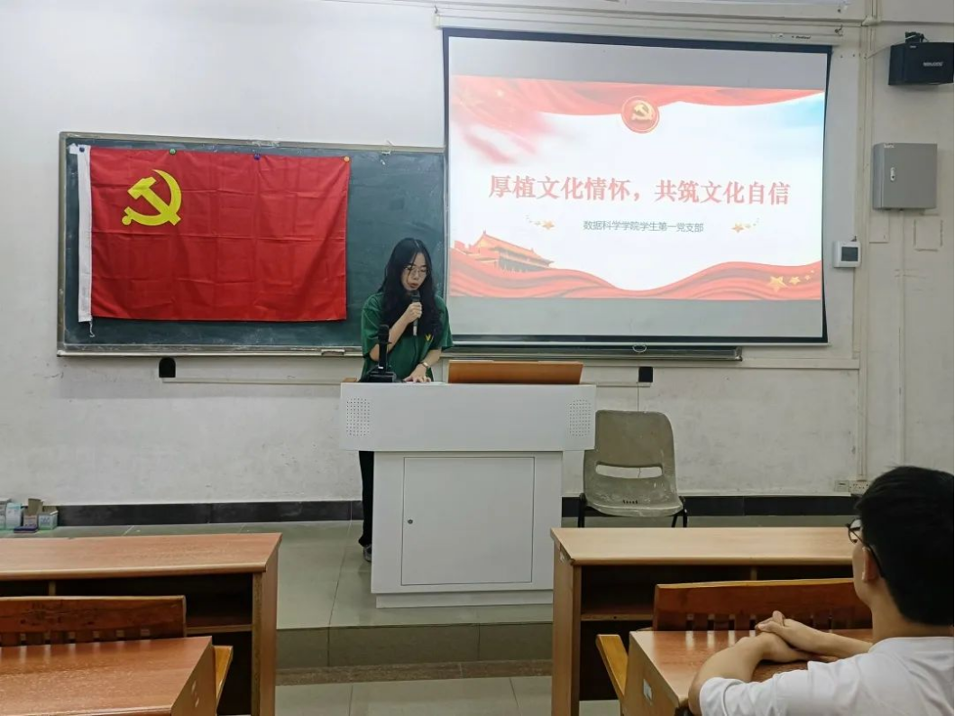 文明生生不息,思想与时俱进。为增强党员新时代新征程宣传思想文化工作的责任感、使命感,数据科学学院学生第一党支部于10月17日17:45在励志楼D102开展“厚植文化情怀,共筑文化自信”党日主题活动。出席本次会议的有数据科学学院学生第一党支部书记裴祖君老师、学生第一党支部全体在校学生党员以及学生第一党支部第29期拟发展对象。本次活动由施宛菁同志主持。