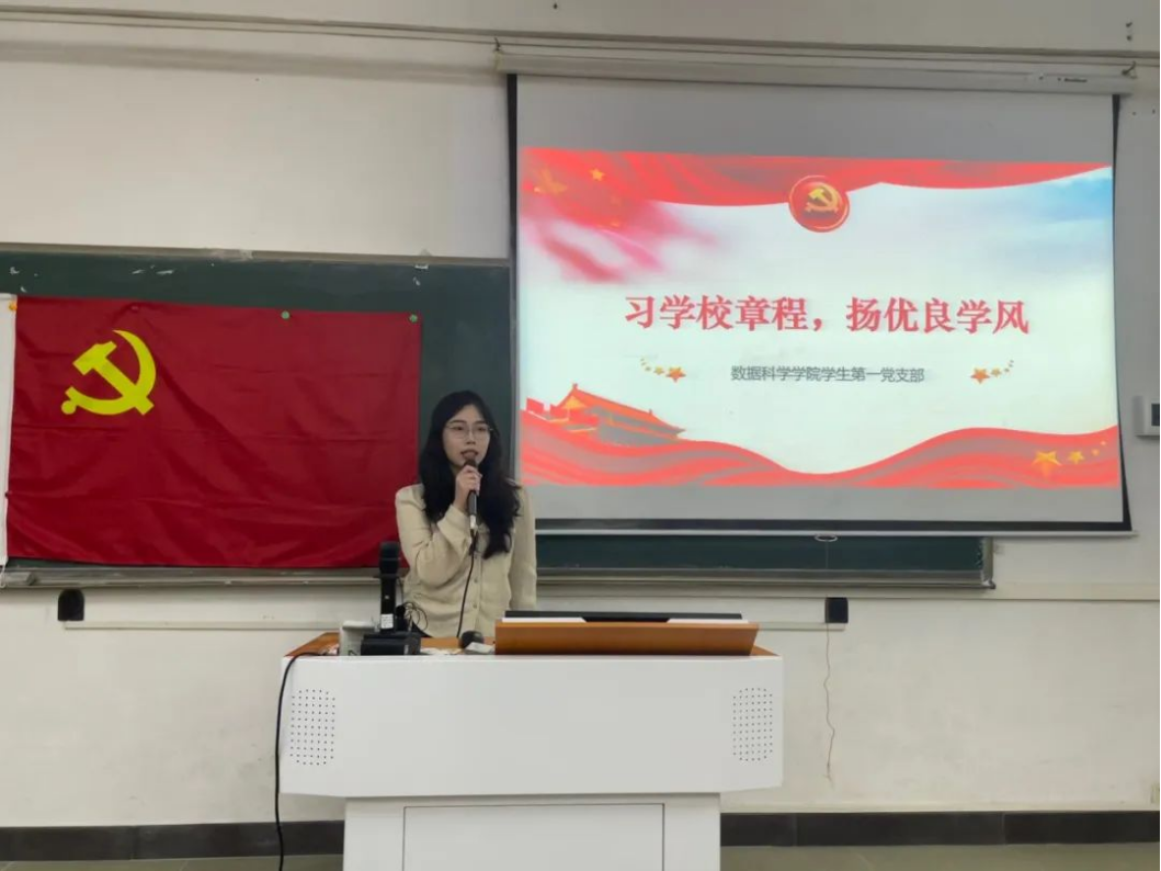 2023年11月20日17:45数据科学学院学生第一党支部于励志楼D102开展“学习学校章程,发扬优良学风”专题学习会。出席本次会议的有数据科学学院学生第一党支部全体在校学生党员。本次会议由施宛菁同志主持。