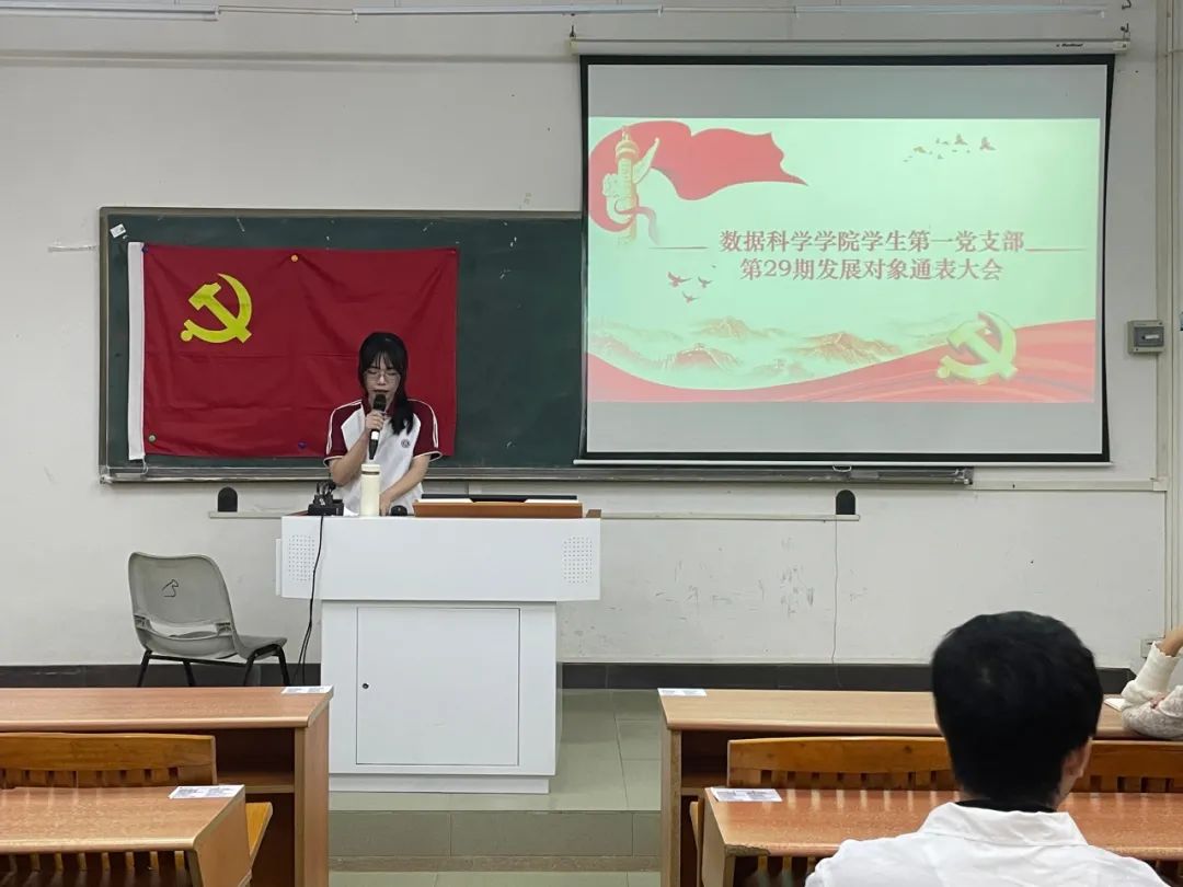 为进一步加强基层党组织建设,发展壮大学生党员队伍,切实提高党员发展质量,保持党员队伍先进性和纯洁性,按照党员发展细则和发展程序要求,数据科学学院学生第一党支部于2023年12月13日17:45,在励志楼D104召开第29期发展对象通表大会。出席本次会议的有数据科学学院学生第一党支部书记裴祖君老师、数据科学学院学生第一党支部全体在校学生党员以及学生第一党支部第29期发展对象。本次大会由施宛菁同志主持。