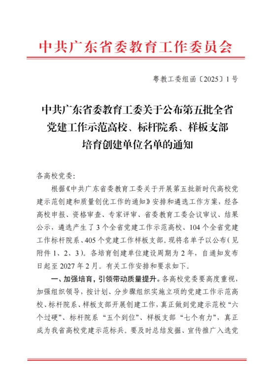 近日,中共广东省委教育工委公布了《第五批全省党建工作示范高校、标杆院系、样板支部培育创建单位名单》,广州华商学院人工智能学院党委成功入选第五批“全省党建工作标杆院系”培育创建单位!这是对我校党建工作的高度肯定,也是人工智能学院党委在党建工作中取得的又一重要成果。
