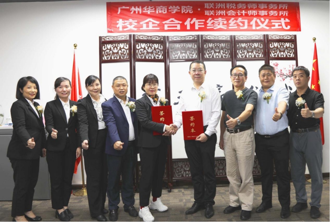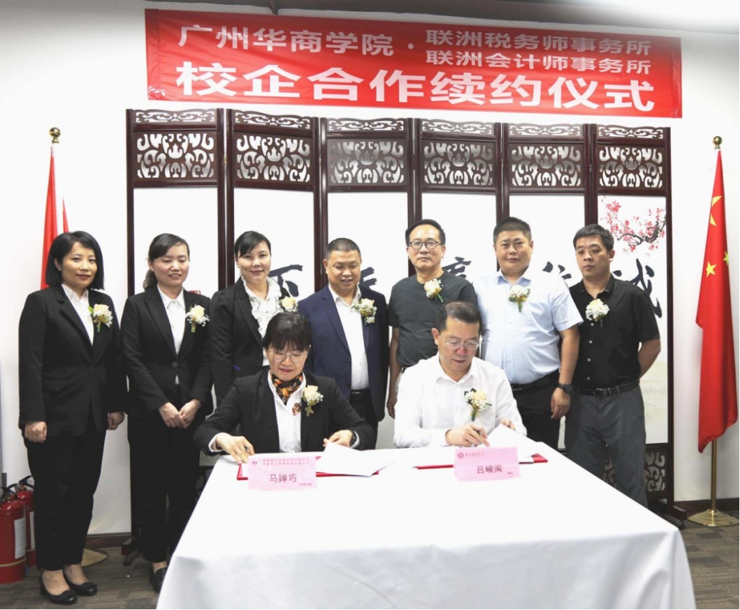 吕峻闽和马蝉巧代表校企双方,签署了联洲税务师事务所有限公司和联洲会计师师事务所有限公司与广州华商学院会计学院“校外实践教学基地”的第二期合作协议书。