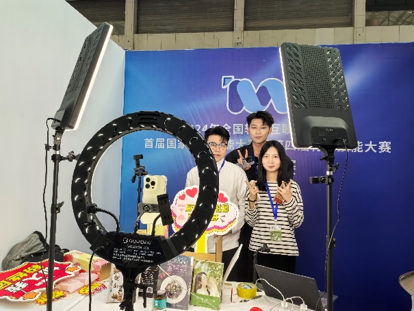 10月29日在全国总决赛现场,选手洪培桐作为主播、郭子琪作为中控,二位学生以超高的默契与专业的直播水平,吸引了现场多人围观并完成了一场线上人气超高的直播。