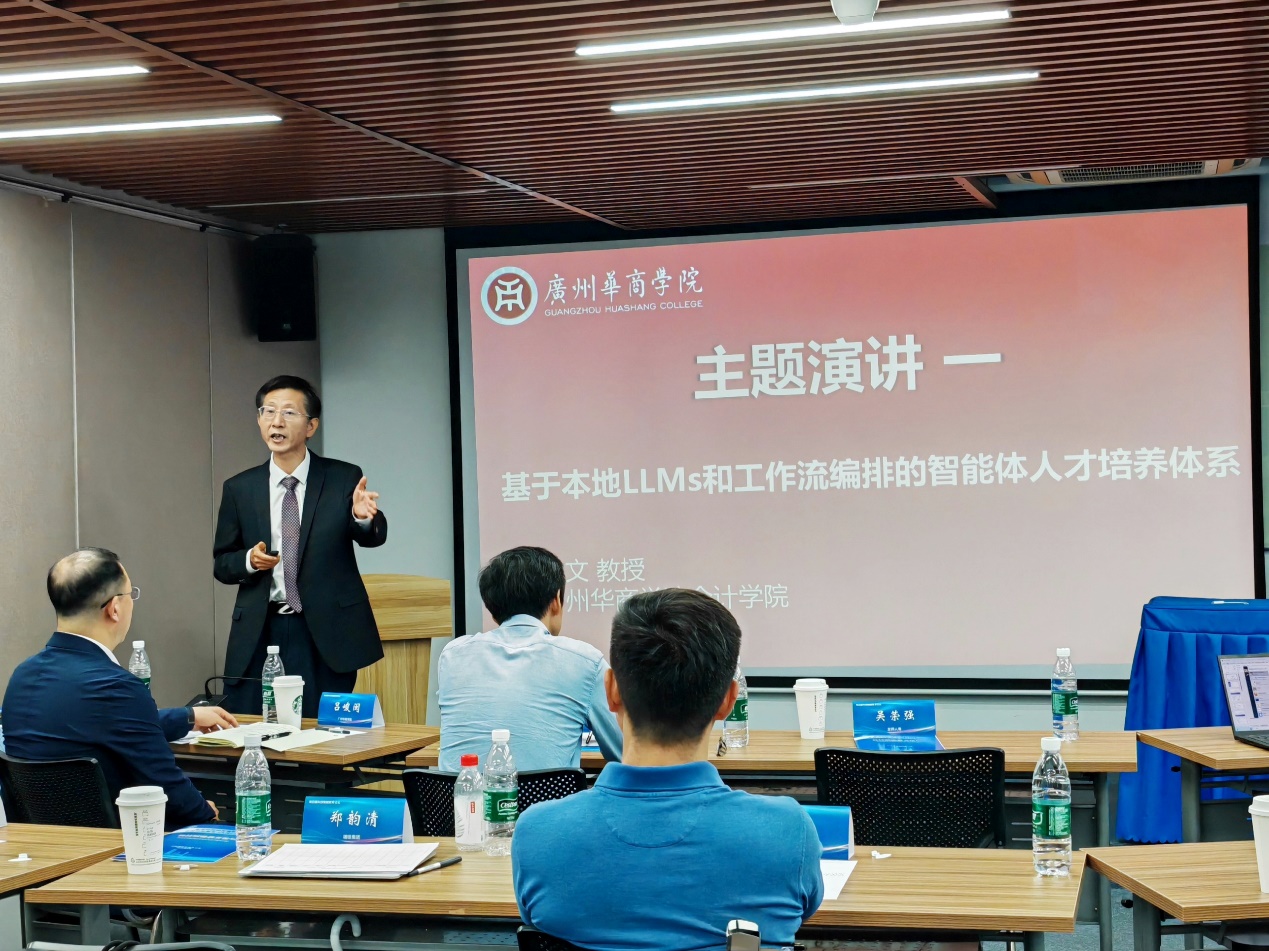 在主题演讲环节,广州华商学院会计学院朱文教授,以“本地LLMs与工作流编排的智能体人才培养体系”为题,深度解析了数智教育的“华商方案”,首次公开展示学院自主研发的“神华AI嵌入平台”。该平台以本地大模型为核心,融合多模态数据处理、知识库构建和智能体开发,搭建了跨学科、全流程、可扩展的人才培养新业态,结合跨学科项目如“企业健康评价”(融合会计学、金融学与AI技术)和“乡村休闲榜单”(整合经济学、统计学与LLMs),实现了从数据治理到智能决策的全链条协作。朱教授强调,无AI不华商”是学校在AI时代背景下的愿景,通过“工作流编排+本地化模型”双轮驱动,为跨学科融合实践提供了新范式,推动“人人会用大模型人人可享高算力人人拥有知识库人人能建智能体”华商校园全面落地。